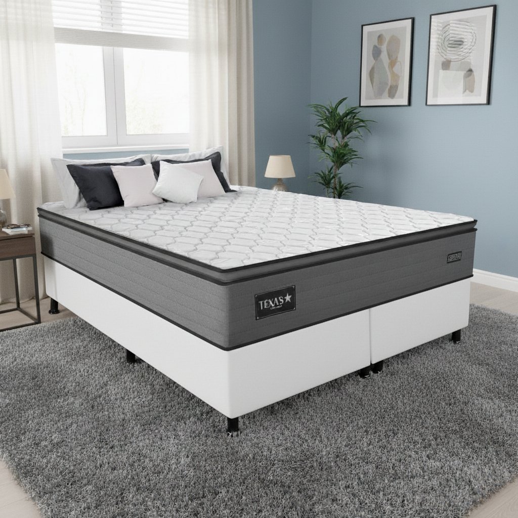 Colchão Queen Texas D28 + Base Box Simples Corino Branco – GAZIN COLCHÕES + ALTO NÍVEL CAMAS E COLCHÕES– Fabricante: Gazin Colchões/Alto Nível